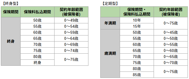 保険期間 | 【終身型】終身【定期型】10年/15年/50歳~85歳(5歳刻み) |