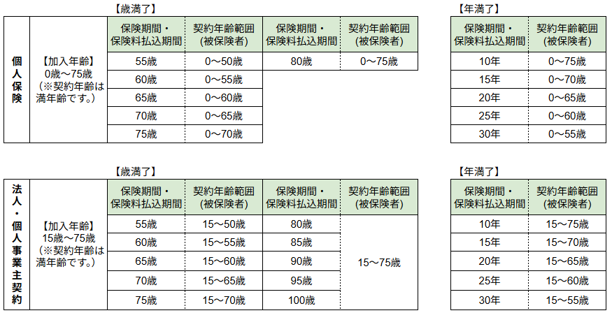 加入年齢・保険期間・保険料払込期間 | 保険期間・保険料払込期間は、年数または年齢で設定できます。 |