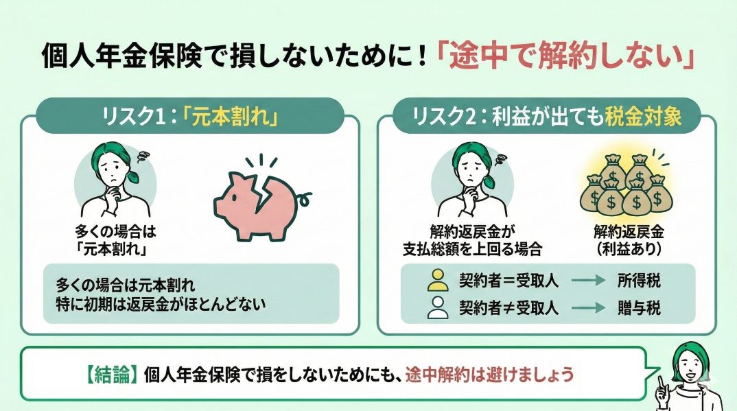 個人年金保険の税金で損をしないためにも、途中解約は避けましょう。