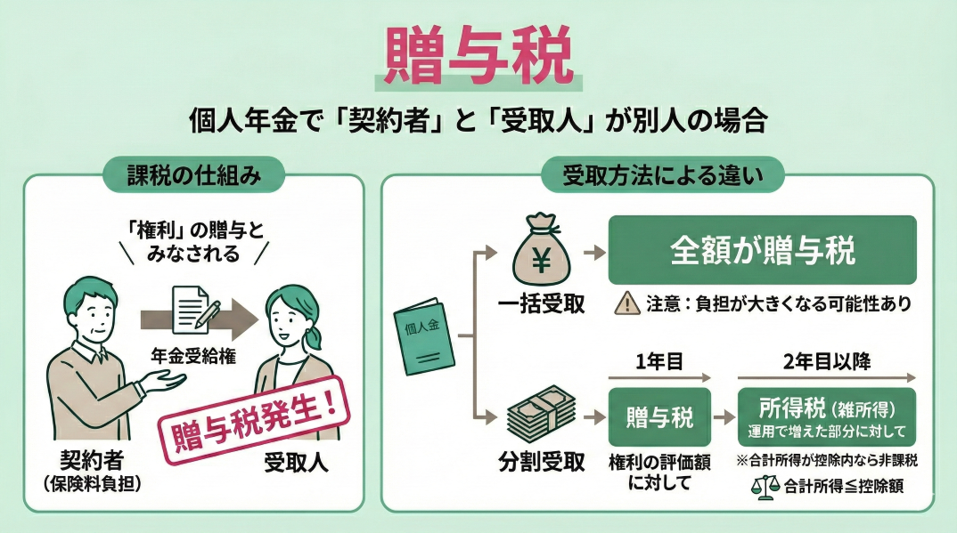 保険料を負担した人(契約者)と年金を受け取る人が別人の場合には、贈与税が課税されます。