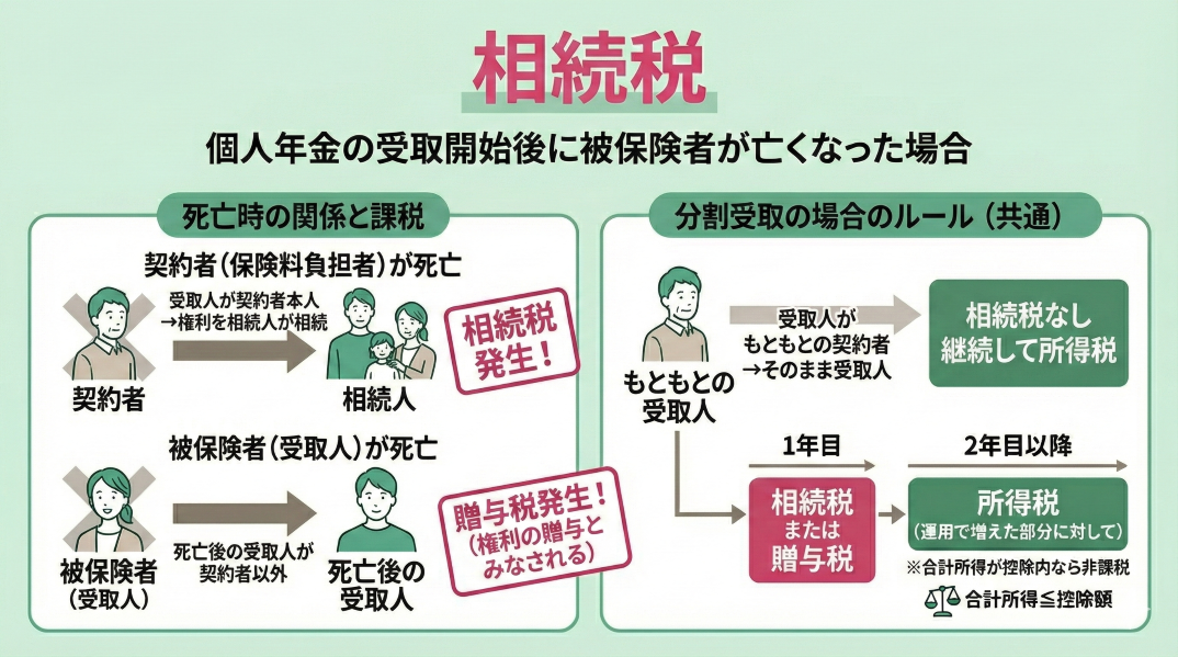 個人年金を分割受け取りに設定した場合、1年目のみ相続税または贈与税がかかり、2年目以降は所得税を支払います。