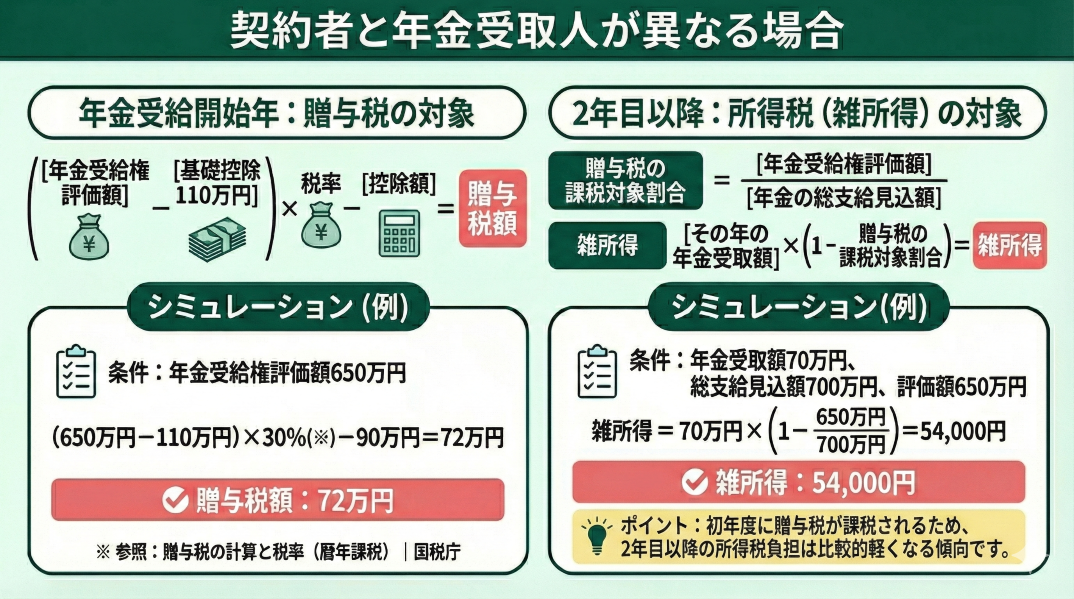 契約者と年金受取人が異なる場合は、年金受給開始年は贈与税、年金受給開始2年目以降は所得税(雑所得)の対象になります。
