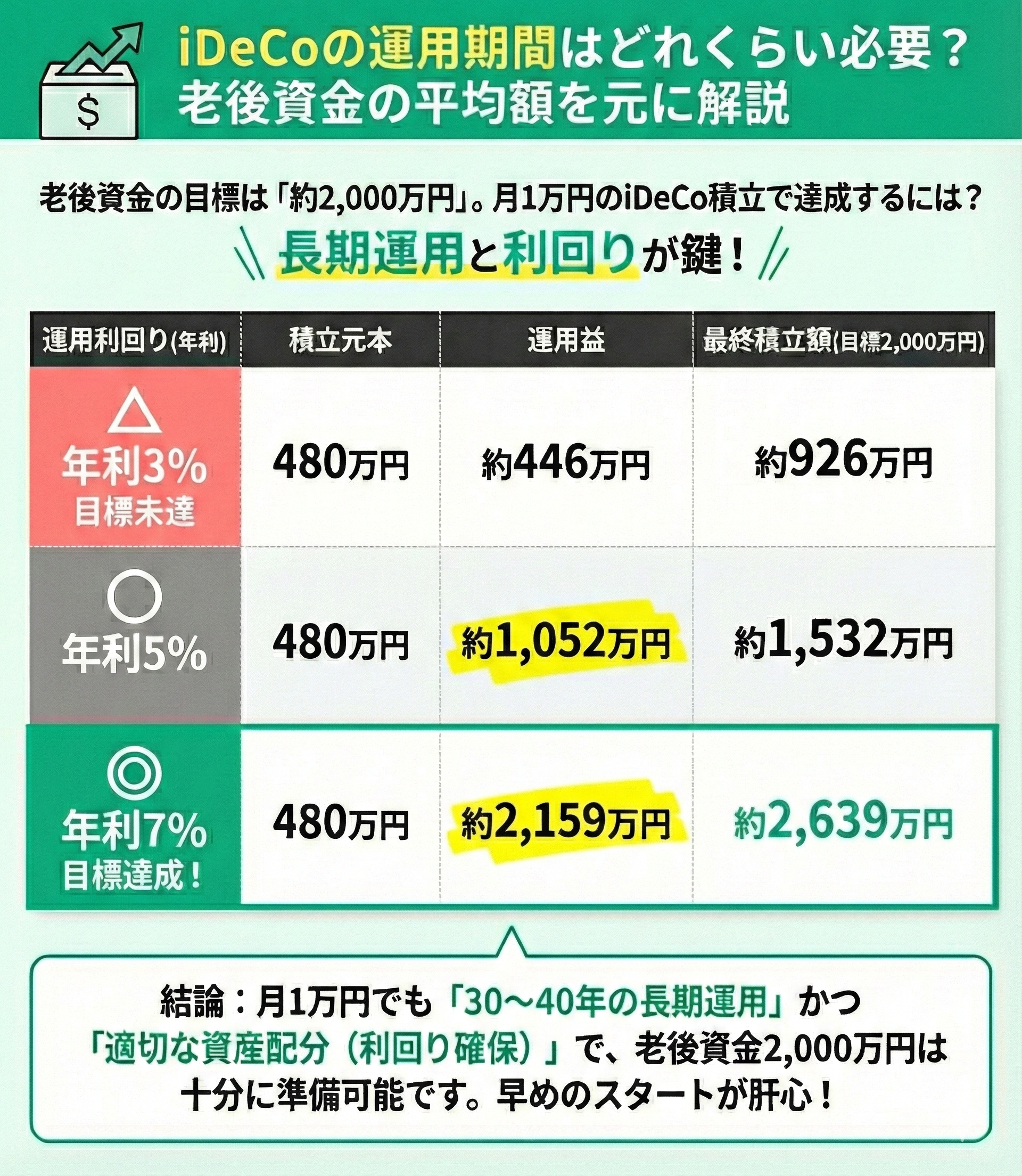 | 40年間 | 年7% | 480万円 | 約2,639万円 | 約2,159万円 |