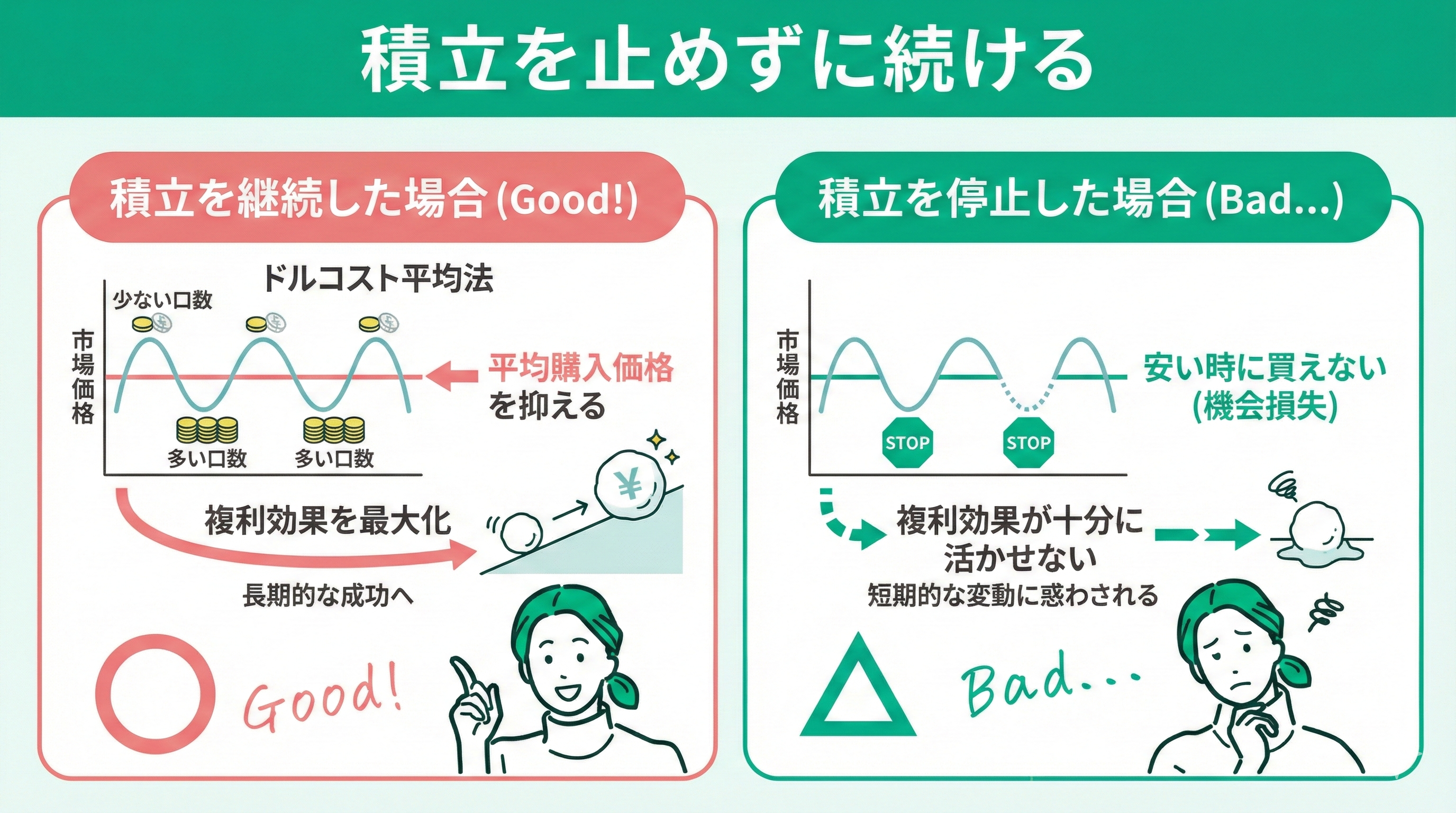 また、一時的な市場の変動に惑わされて積立を停止すると、複利効果を十分に活用できなくなります。