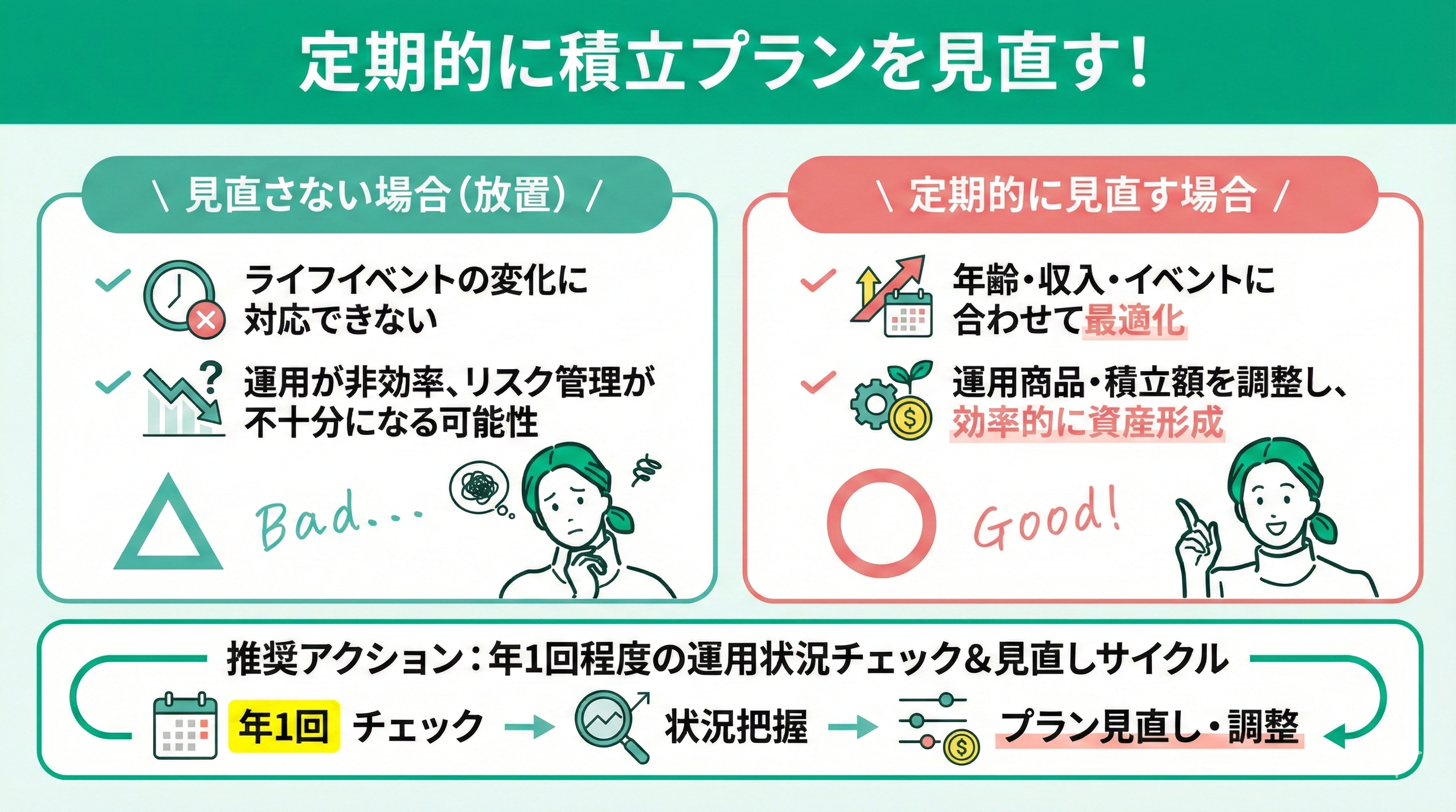 年1回程度は運用状況をチェックし、必要に応じてプランの見直しを行うことをおすすめします。
