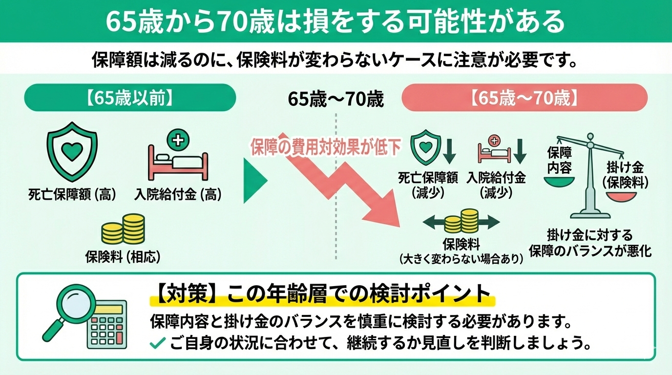 この年齢層では、死亡保障額が減少したり、入院給付金の日額が下がったりする一方、保険料が大きく変わらない場合があり、掛け金に対する保障の費用対効果が低下する可能性があります。