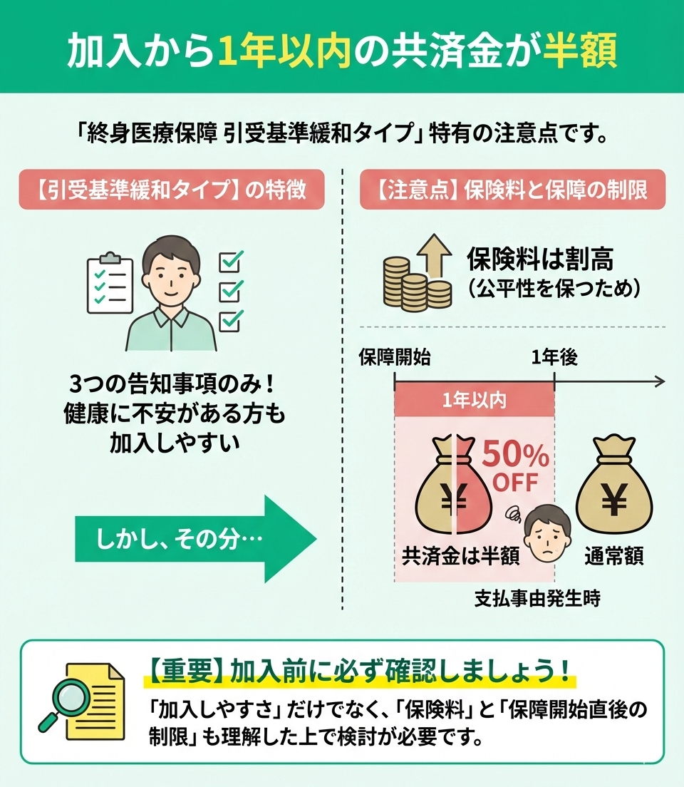 2つめのデメリットは、「終身医療保障タイプ」のなかの「引受基準緩和タイプ」について、加入から1年以内の共済金が半額になってしまうことです。