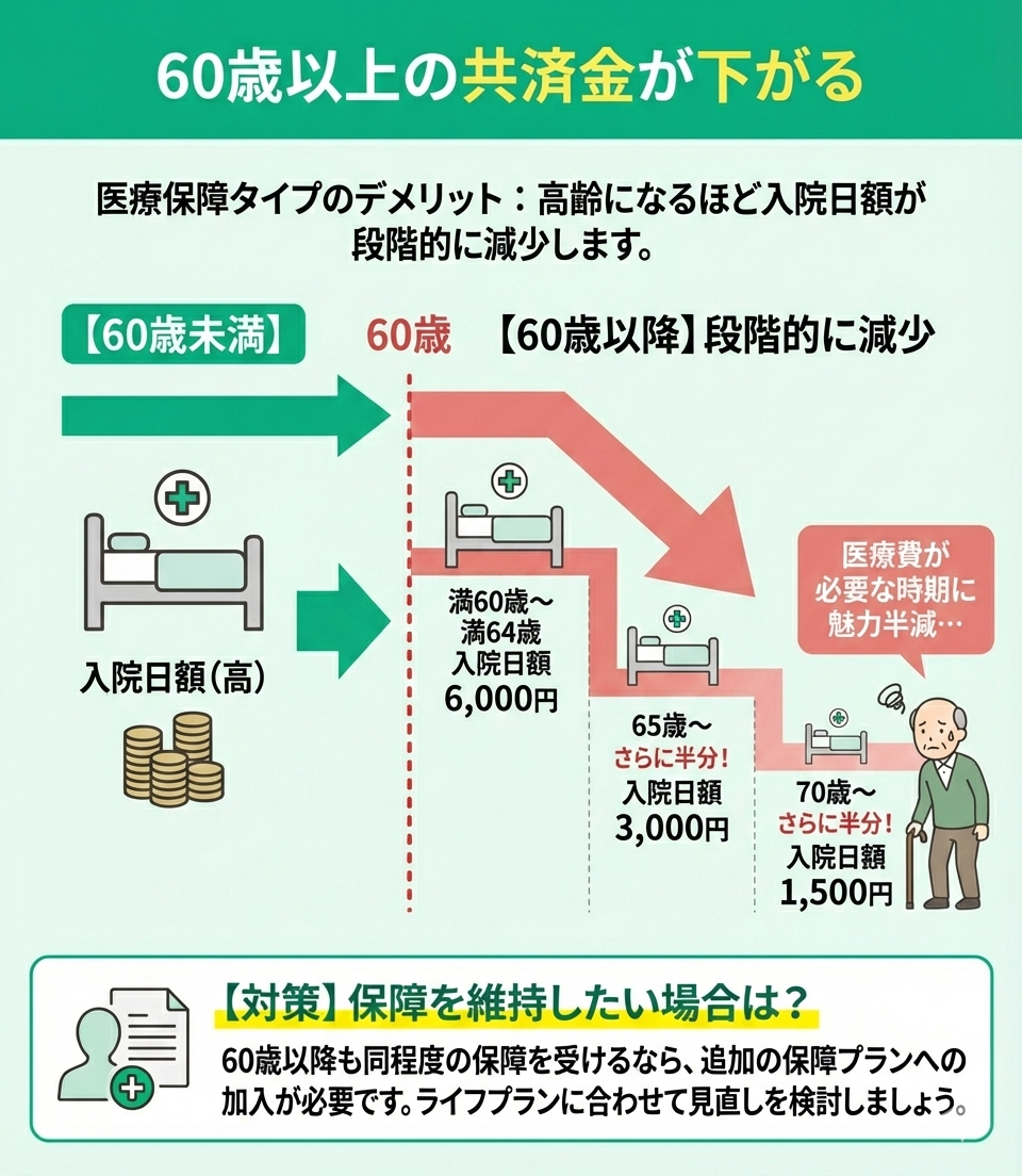 医療保障タイプのデメリットの1つめは、60歳以上になると共済金額が下がることです。