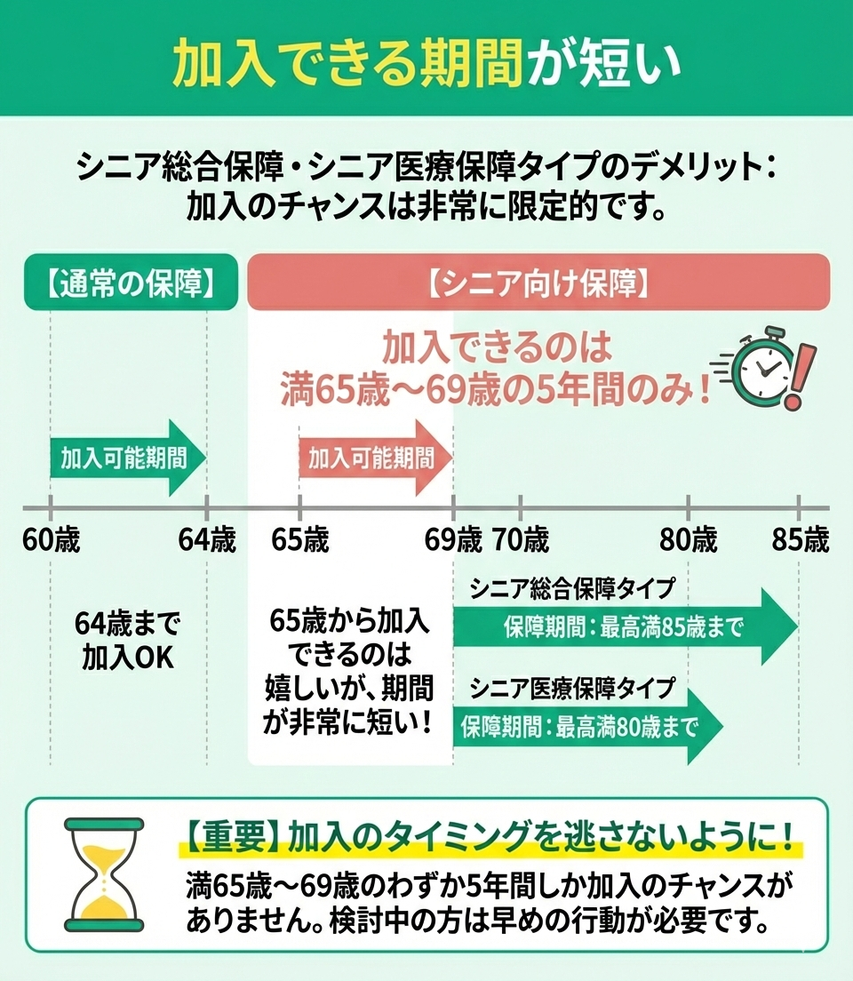 シニア総合保障・シニア医療保障タイプのデメリットの1つめは、加入できる期間が短いということです。