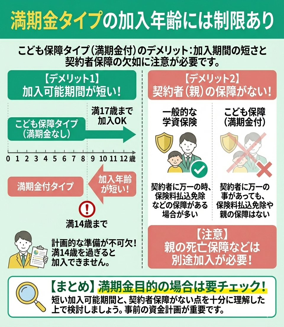 こども保障タイプ・満期金付タイプのデメリットの1つめは、入学や進学時期に合わせて計画性を持って加入する必要があることです。
