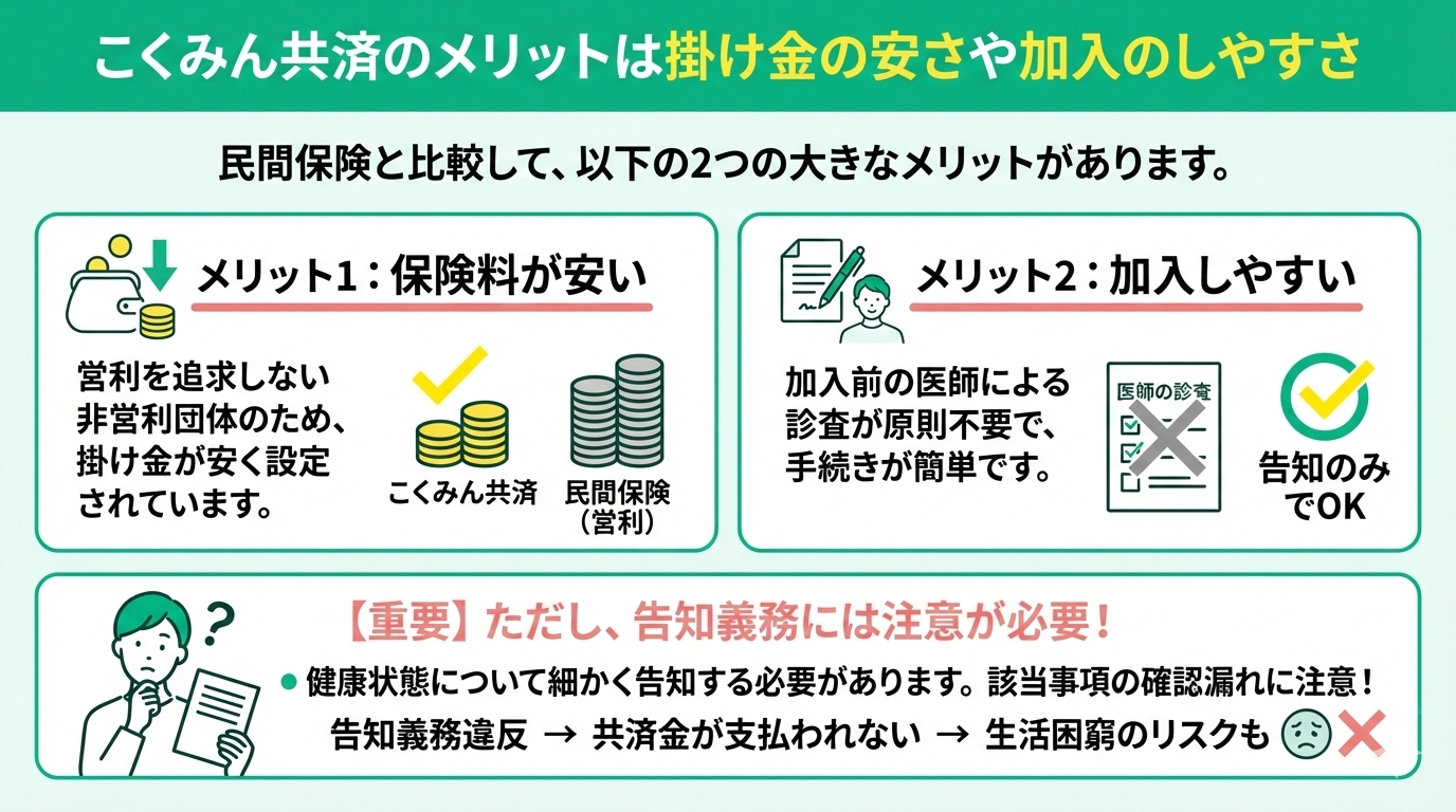 - こくみん共済のメリットは掛け金の安さや加入のしやすさ
