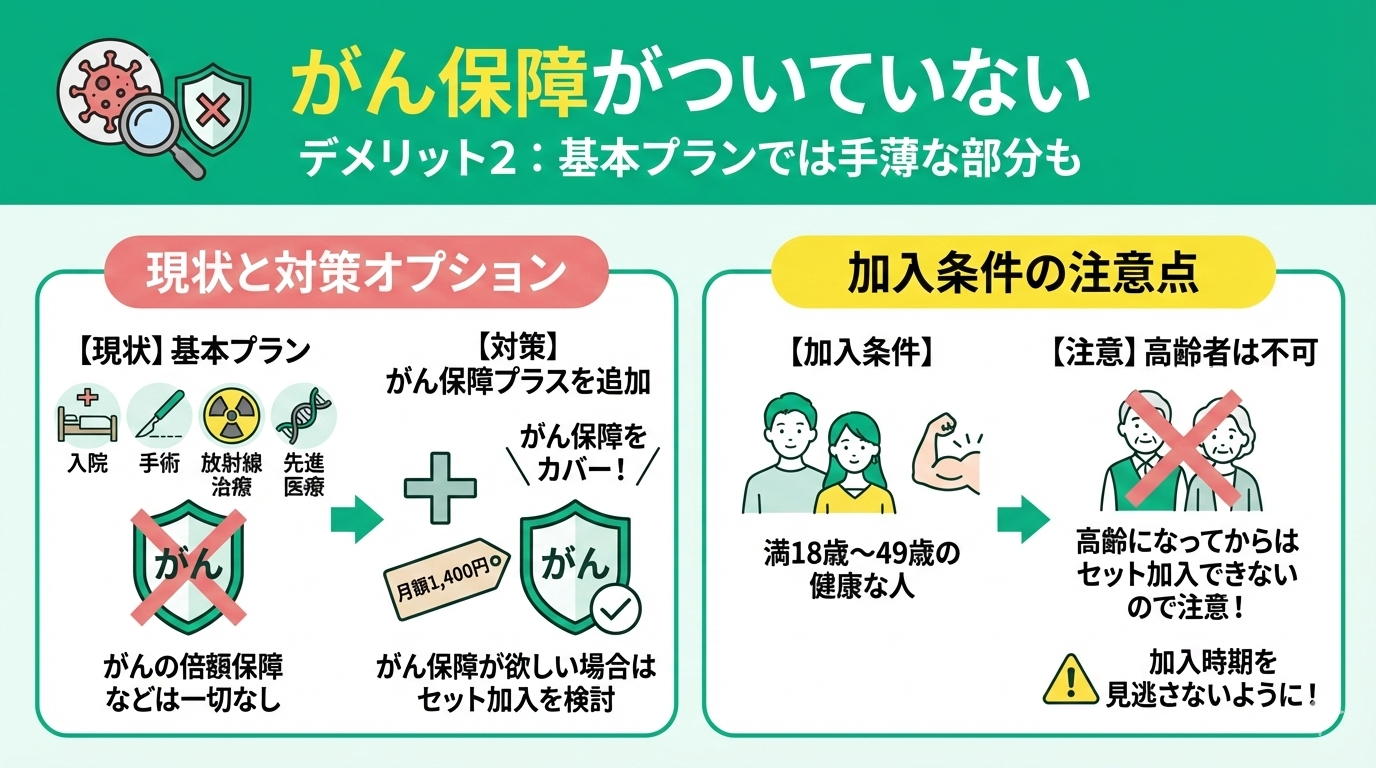 このデメリットはケガの保障を充実させたい方にとって、今後の保障内容を考えるうえで考慮すべき重要な要素です。