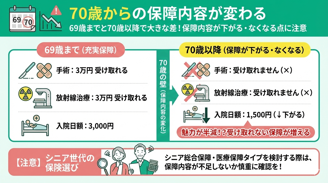 例えば、医療保障タイプの場合、69歳までは手術したときに3万円を受け取れますが、70歳からは受け取れません。
