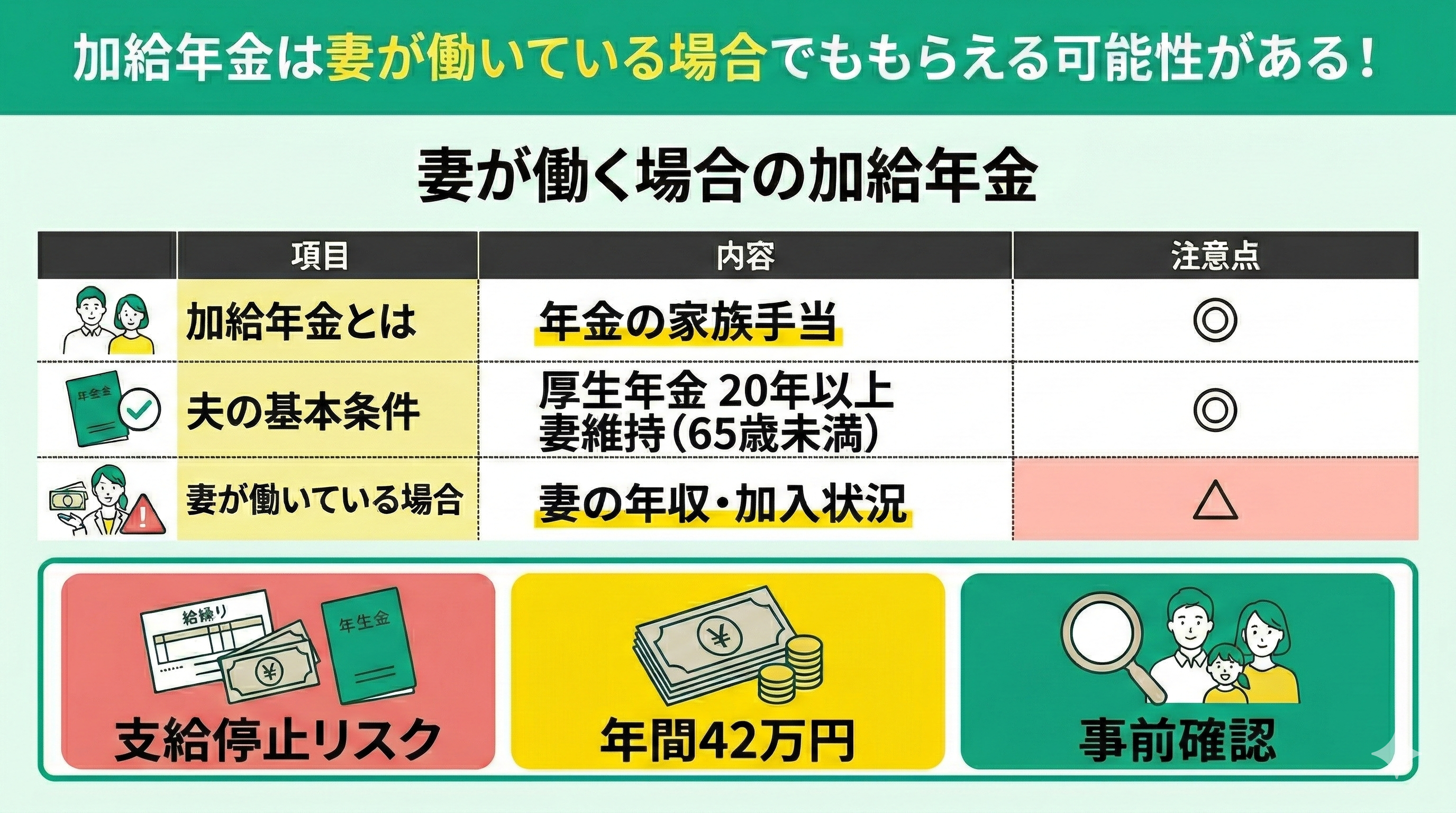 しかし、奥様の年収や厚生年金の加入状況によっては、年間約42万円の加給年金が支給停止になるリスクが潜んでいます。