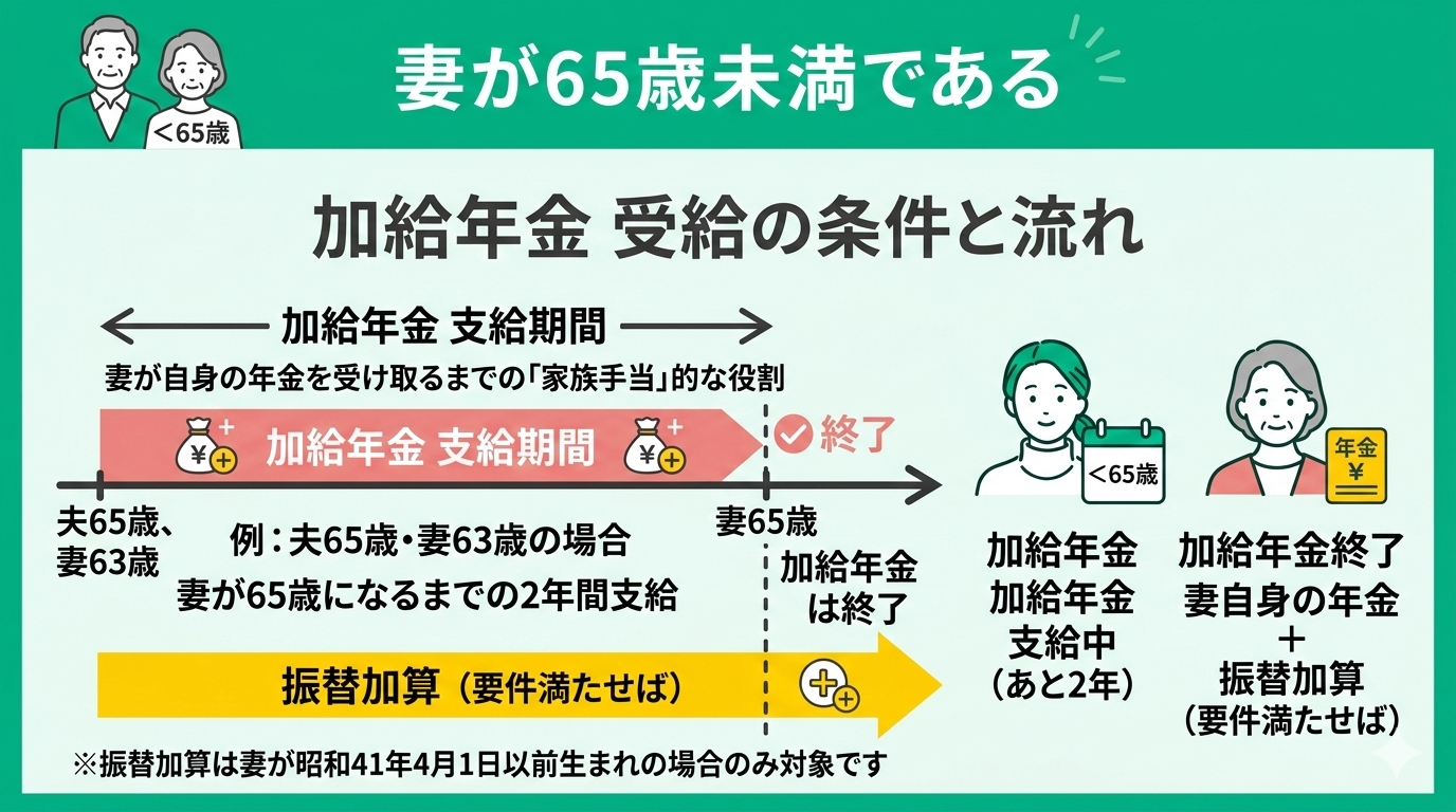 | 支給要件 | 妻が65歳未満 | 夫の加給年金終了 |