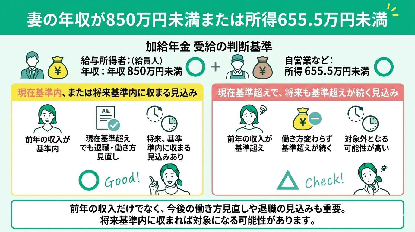 妻が加給年金を受け取るには、年収850万円未満(自営業などは所得655.5万円未満)という要件を満たす必要があります。これは前年の収入で判断されますが、今後もその水準が続く見込みがあるかどうかも重要です。