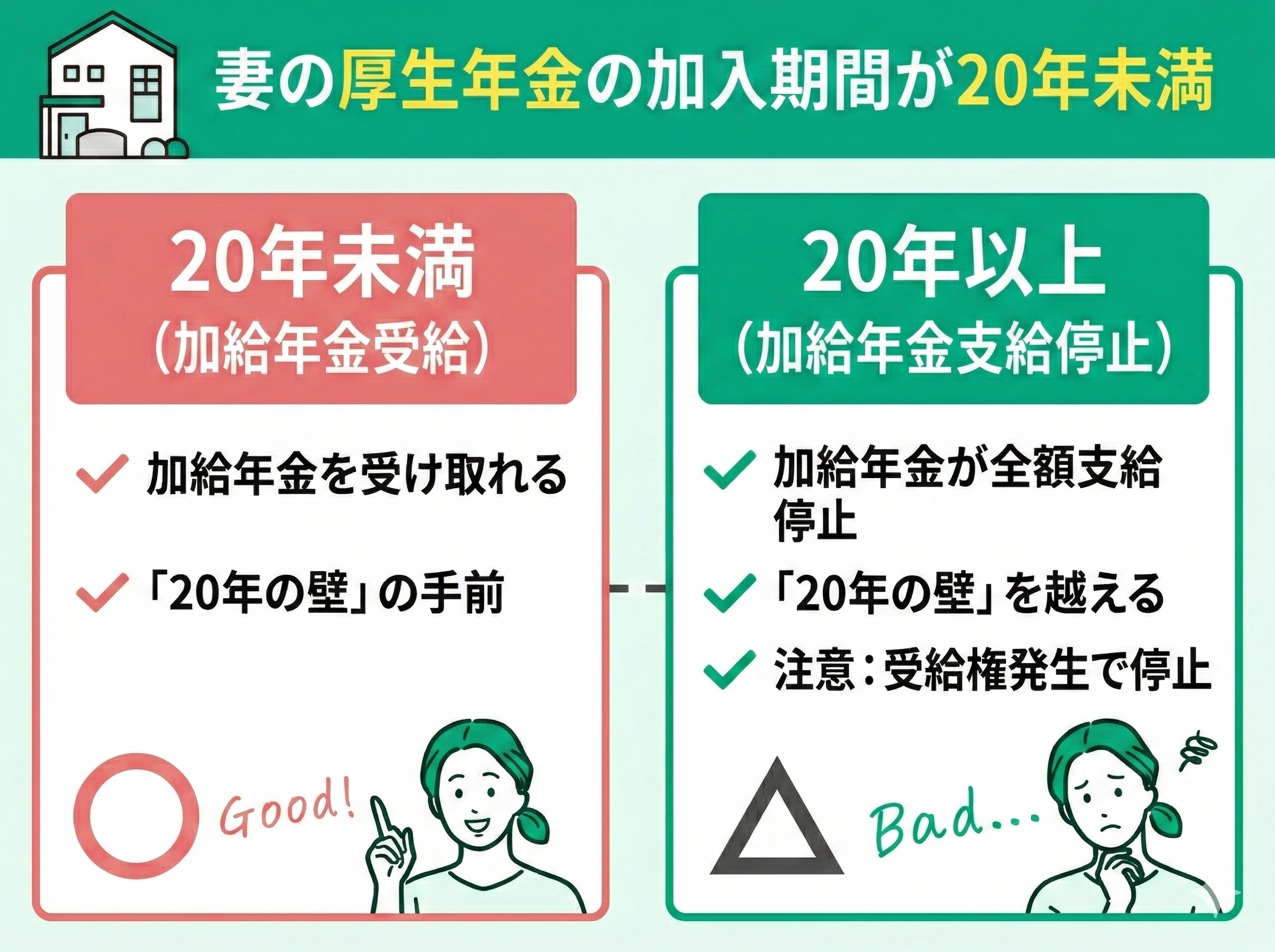 加給年金を受け取るには、妻自身の厚生年金加入期間が「20年未満」であることが条件です。