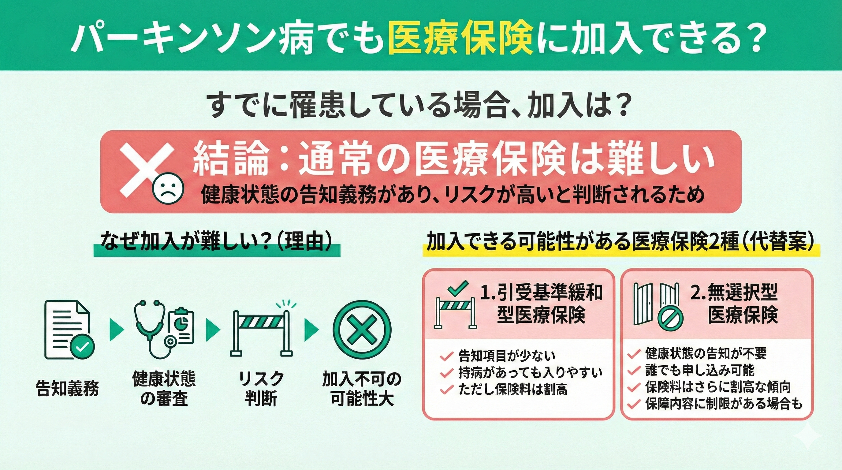 結論として、パーキンソン病の人が通常の医療保険に加入するのは難しいと言わざるを得ません。