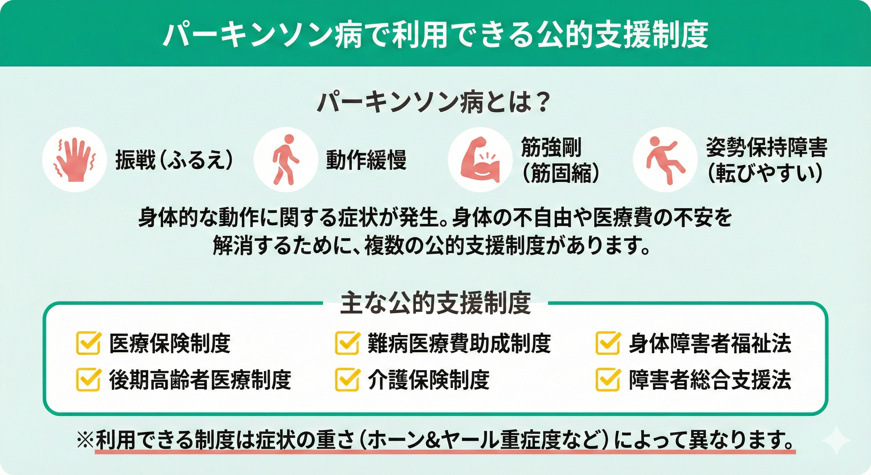 - パーキンソン病の人が利用できる公的支援制度は複数存在するが、条件があるため最適な制度を選択する必要がある