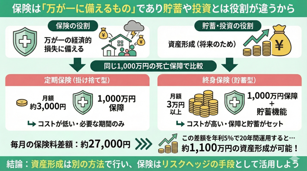 - 保険は「万が一に備えるもの」であり貯蓄や投資とは役割が違うから