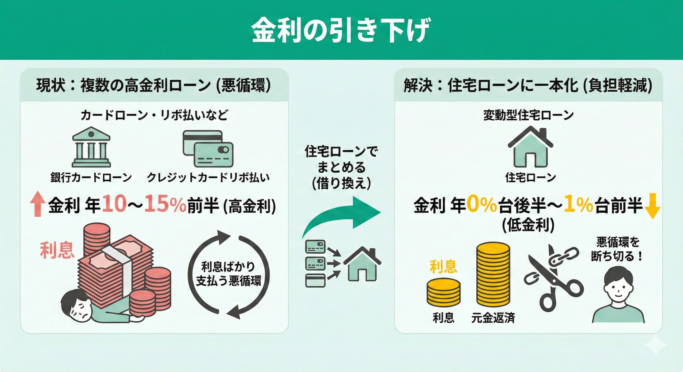 しかし住宅ローンの低金利で借り換えれば、その悪循環を断ち切ることができるのでおすすめです。