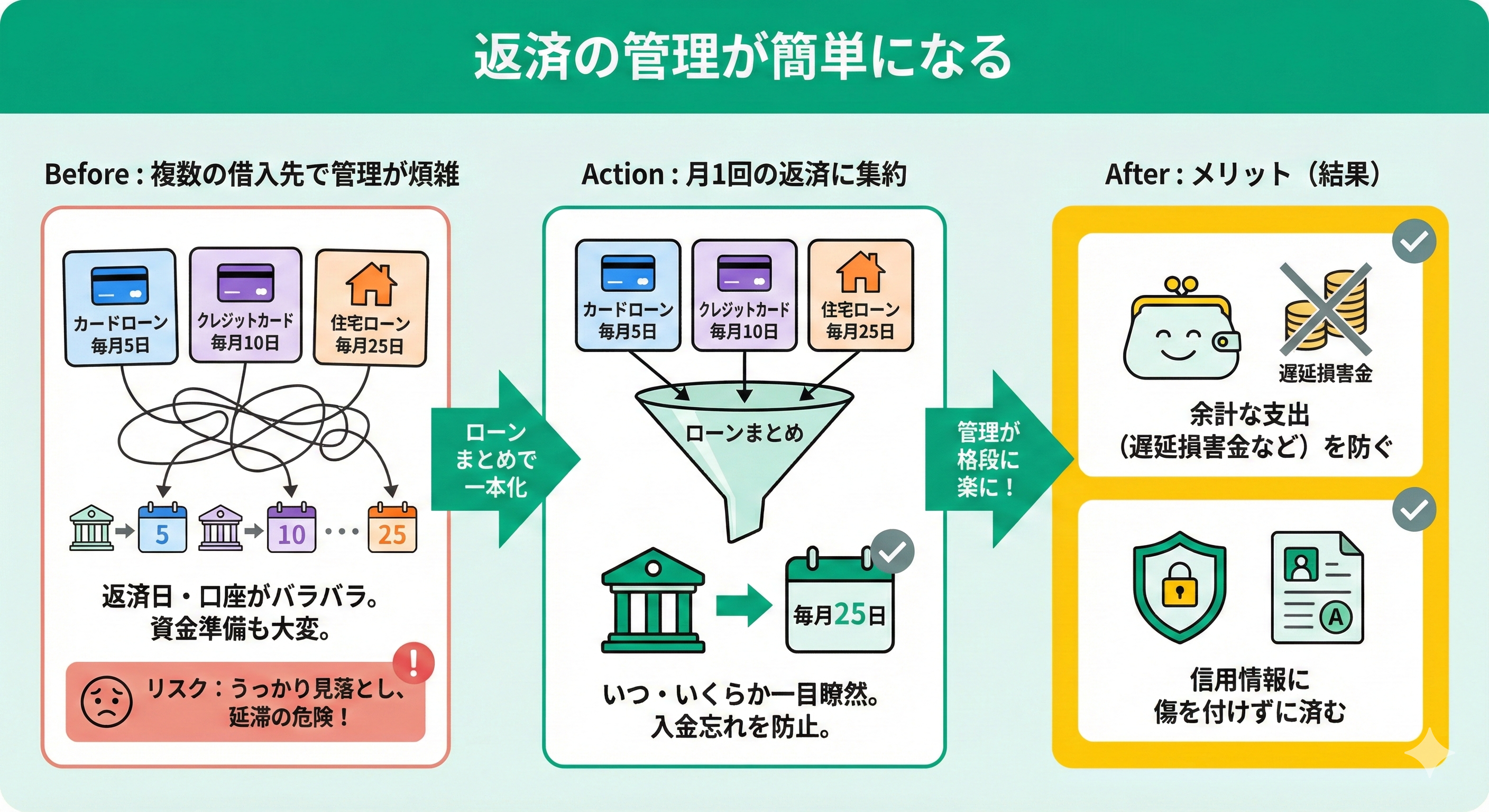返済管理がシンプルになることで心理的な負担が軽減され「このまま返済を続ければ完済できる」という見通しが立つため、精神的にも余裕が生まれます。
