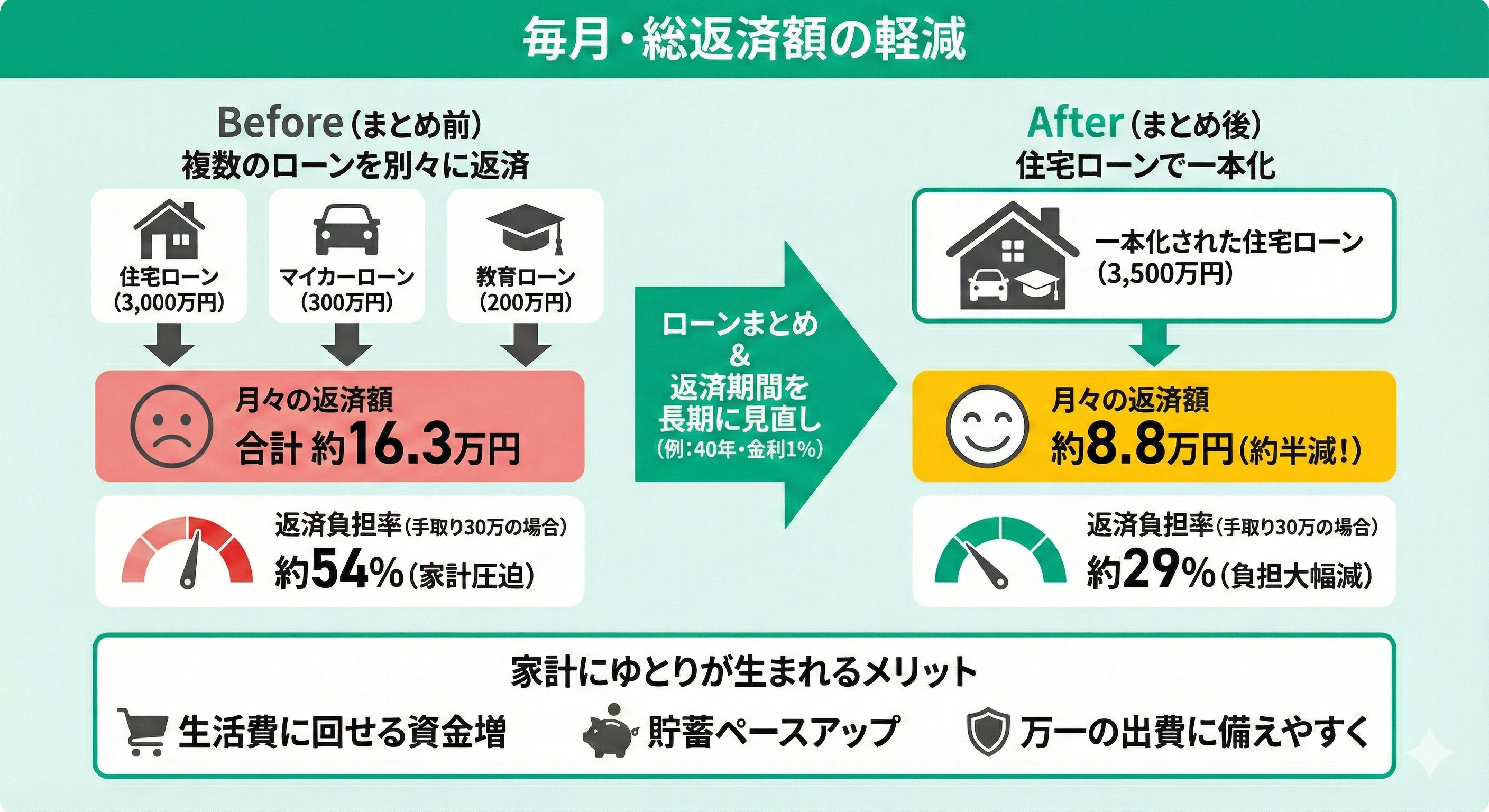 これは、返済期間を住宅ローン並みに長期に見直すことで、月々の支払負担が大幅に軽減されるためです。