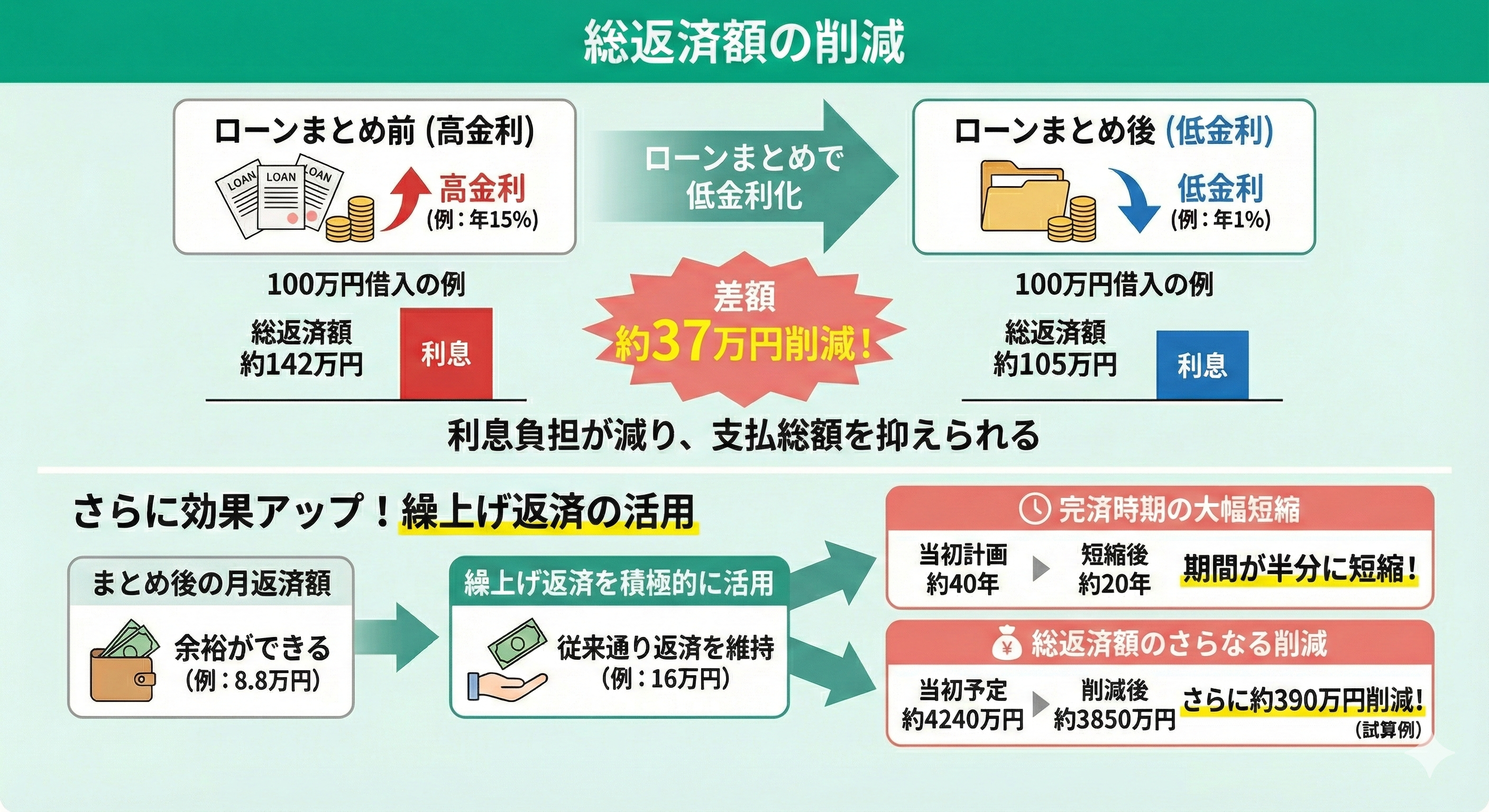 つまり、まとめることによって利息負担を減らせれば、その分だけ支払総額を小さくできます。