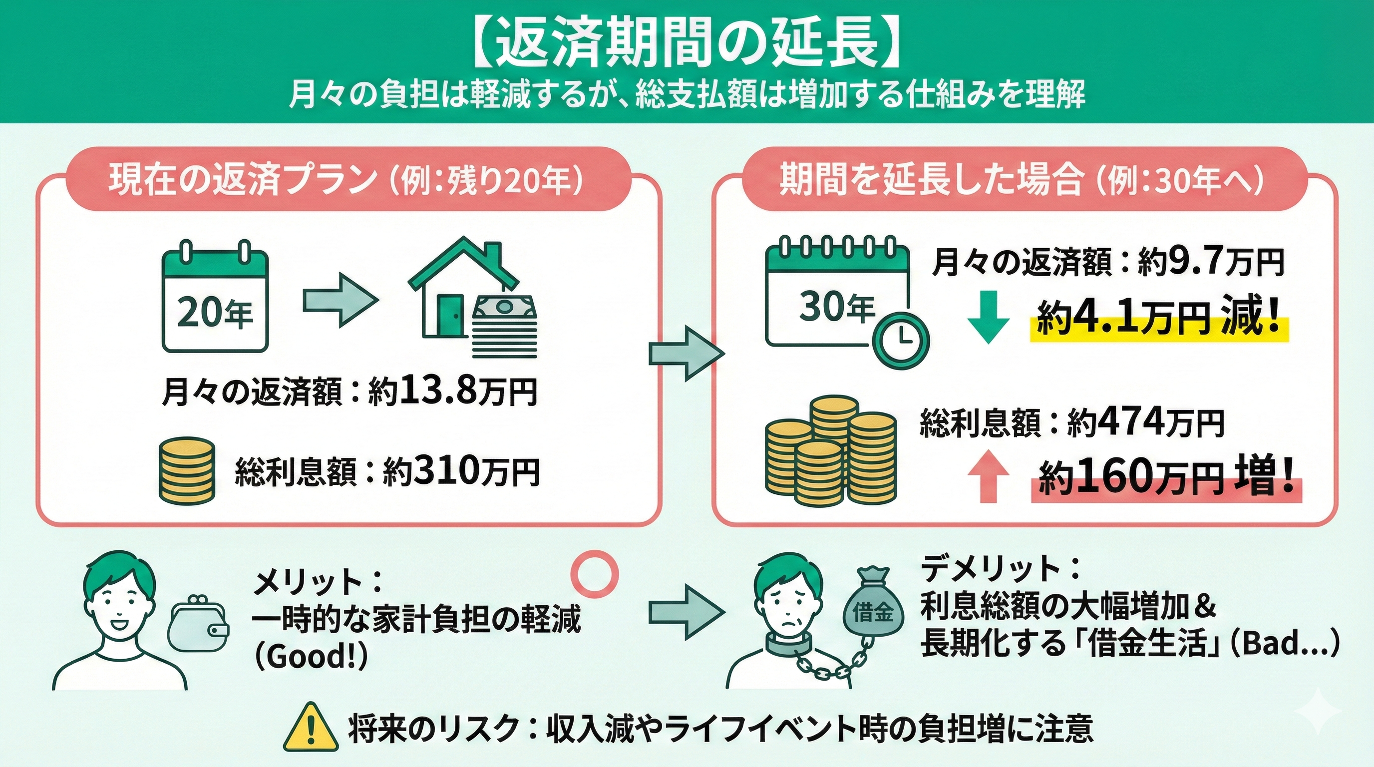 返済期間を延ばせば家計の負担は一時的に軽くなりますが、長期的には利息総額が膨らみ、トータルで損になる可能性があります。