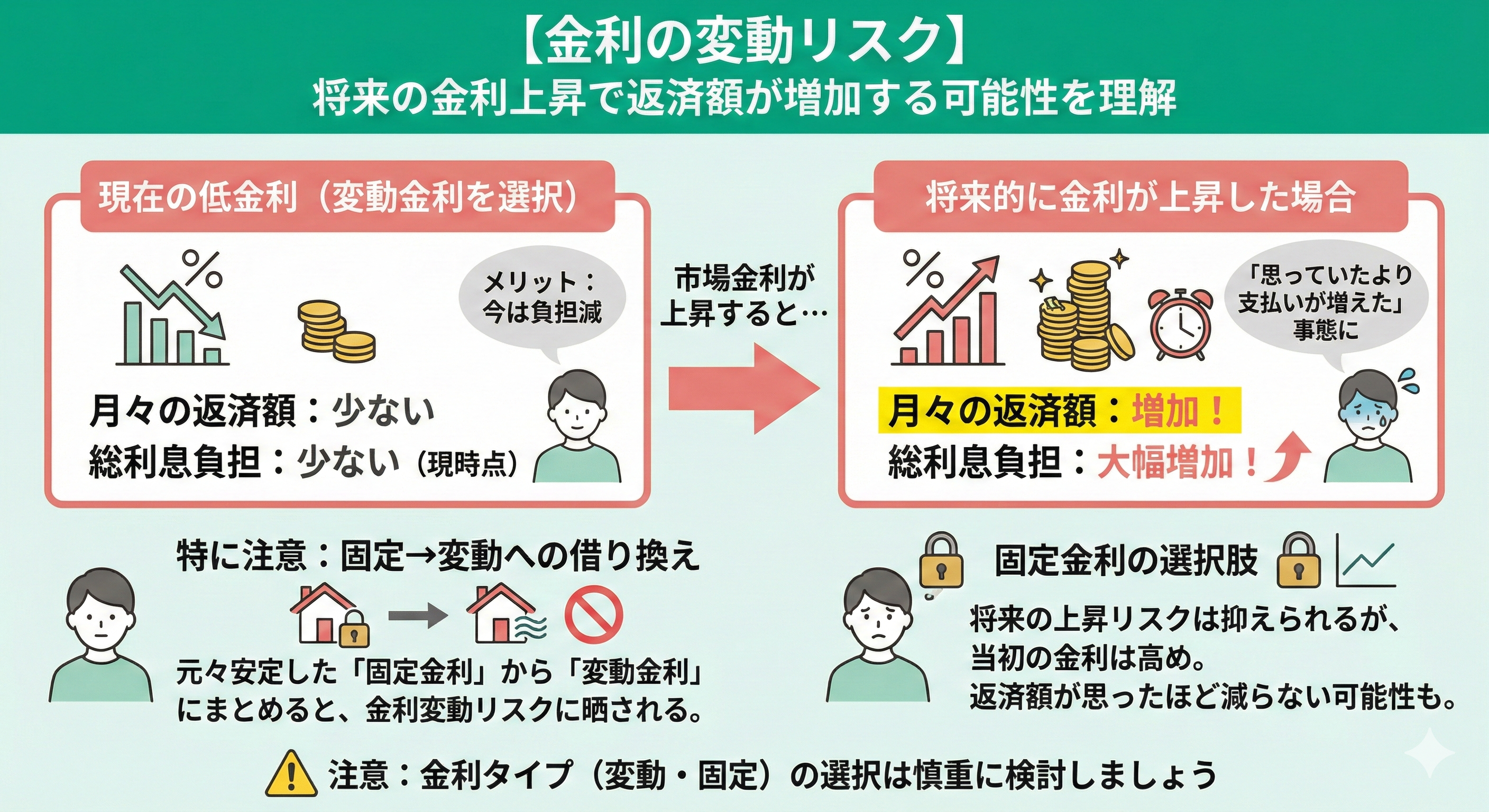 現在は低金利でも、今後市場金利が上がれば月々の返済額や総利息負担が当初の試算より大きくなり「思っていたより支払いが増えてしまった」という事態になりかねません。
