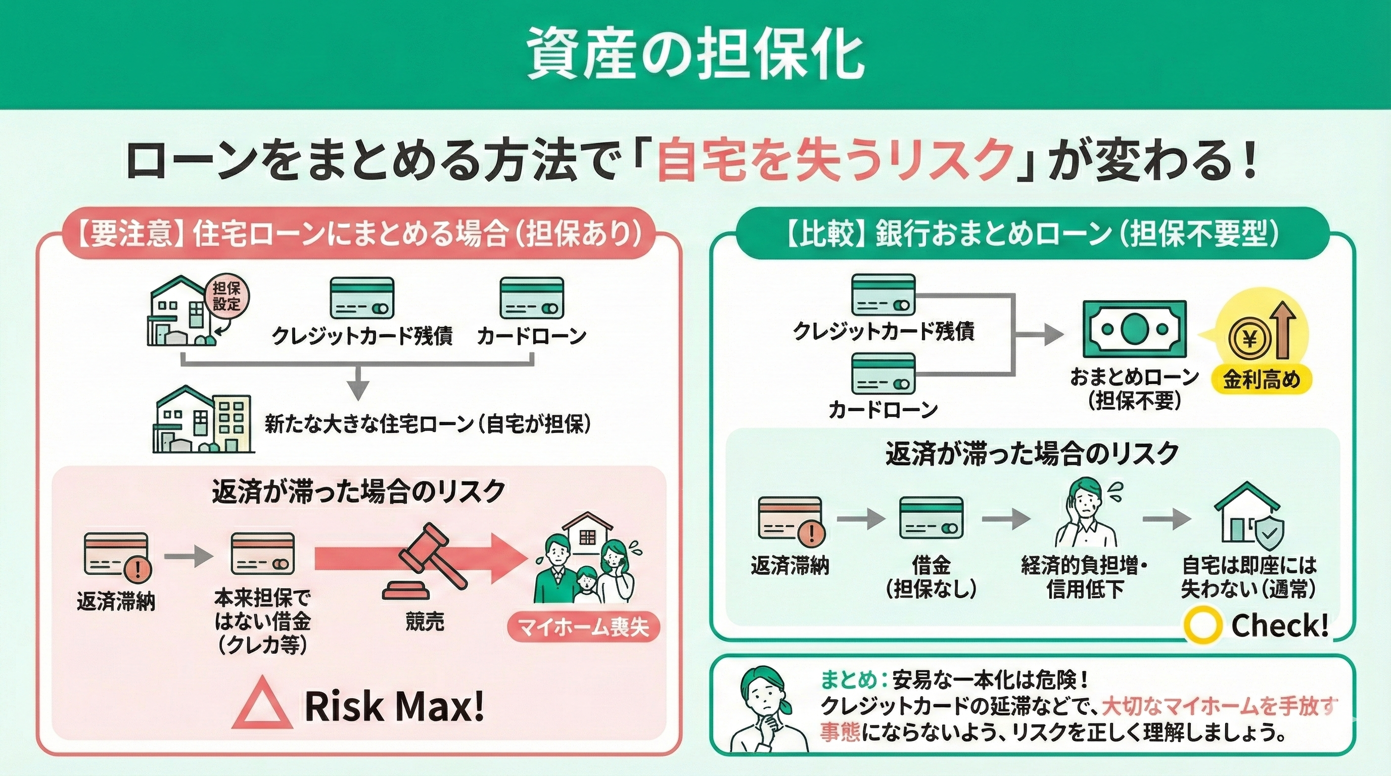 つまり、まとめ後のローンの返済が滞った場合、従来であれば資産を失うリスクが低かった債務についても、最悪の場合は自宅を失うリスクが生じてしまいます。