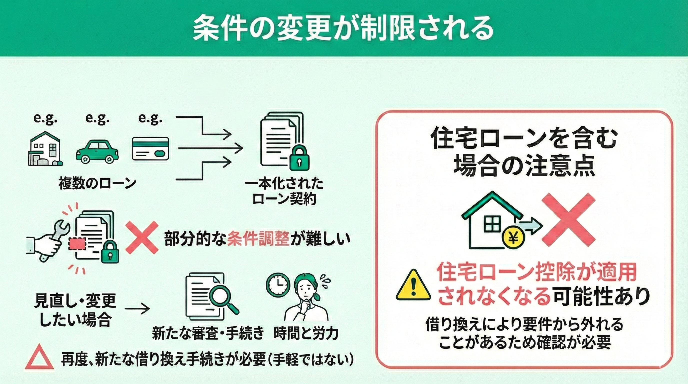 ローンをまとめて一本化すると、その後で契約条件の変更を柔軟に行いにくくなる点にも注意が必要です。