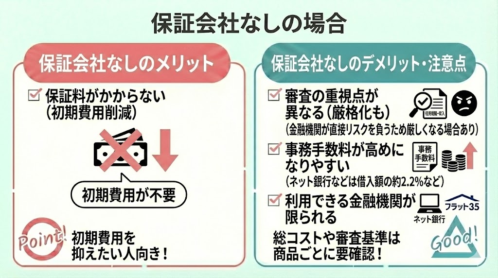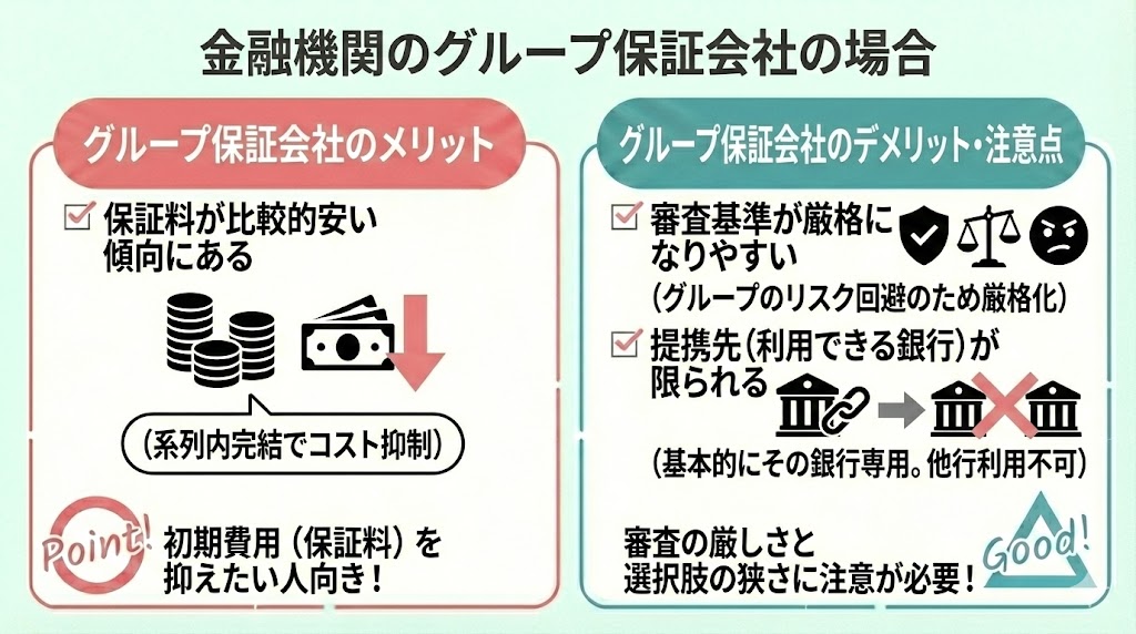 一方で、審査基準が厳格になりやすい分、保証料が比較的安く設定されていることが多いというメリットもあります。
