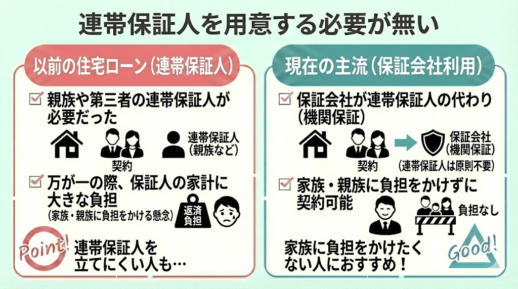 住宅ローンで保証会社を利用するメリットは「連帯保証人を用意する必要が無い」点です。