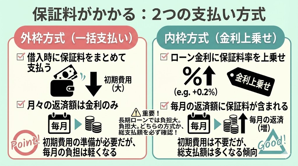 保証料は金融機関や契約内容によって異なりますが、住宅ローンの場合、「外枠方式」と「内枠方式」の2種類であることが一般的となっています。