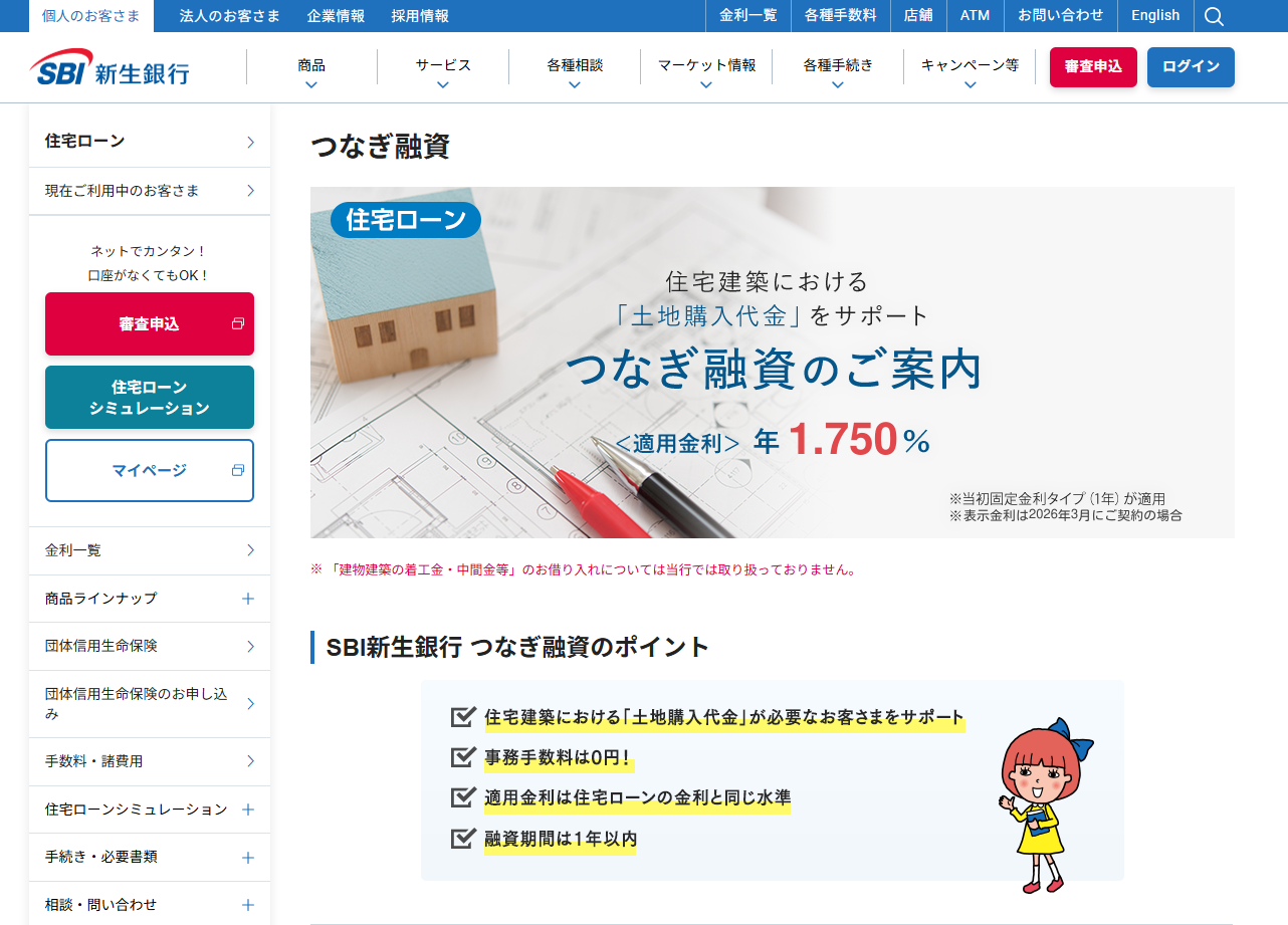 つなぎ融資の金利は年1.750%~2.625%程度(2026年3月時点)と低水準で、事務手数料は約11万円です。手数料体系がシンプルで分かりやすいのが特徴です。
