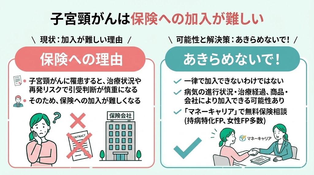 - 子宮頸がんになると一般の医療保険・がん保険への加入は制限される場合がある