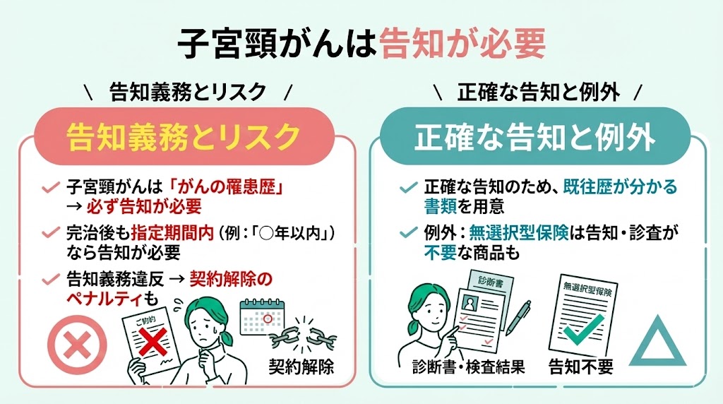すでに子宮頸がんが完治している方であっても、罹患時期が告知項目で「〇年以内」と定められた期間に該当する場合には、告知が必要になる場合があるので注意が必要です。