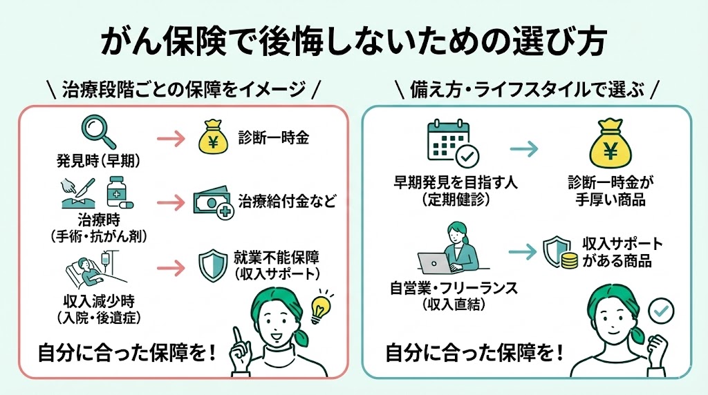 ここでは、がん保険に加入してから後悔しないための、選び方のポイントを紹介します。