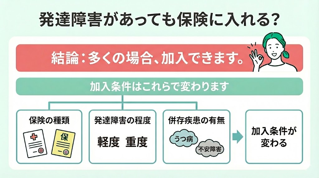 発達障害以外の疾患がなく、状態が安定していて服薬がない(または医師の管理下で安定している)場合は、加入できる可能性があります。通院が経過観察など定期的なフォローアップ中心で、過去2年以内に入院・手術がない場合も、検討しやすくなります。