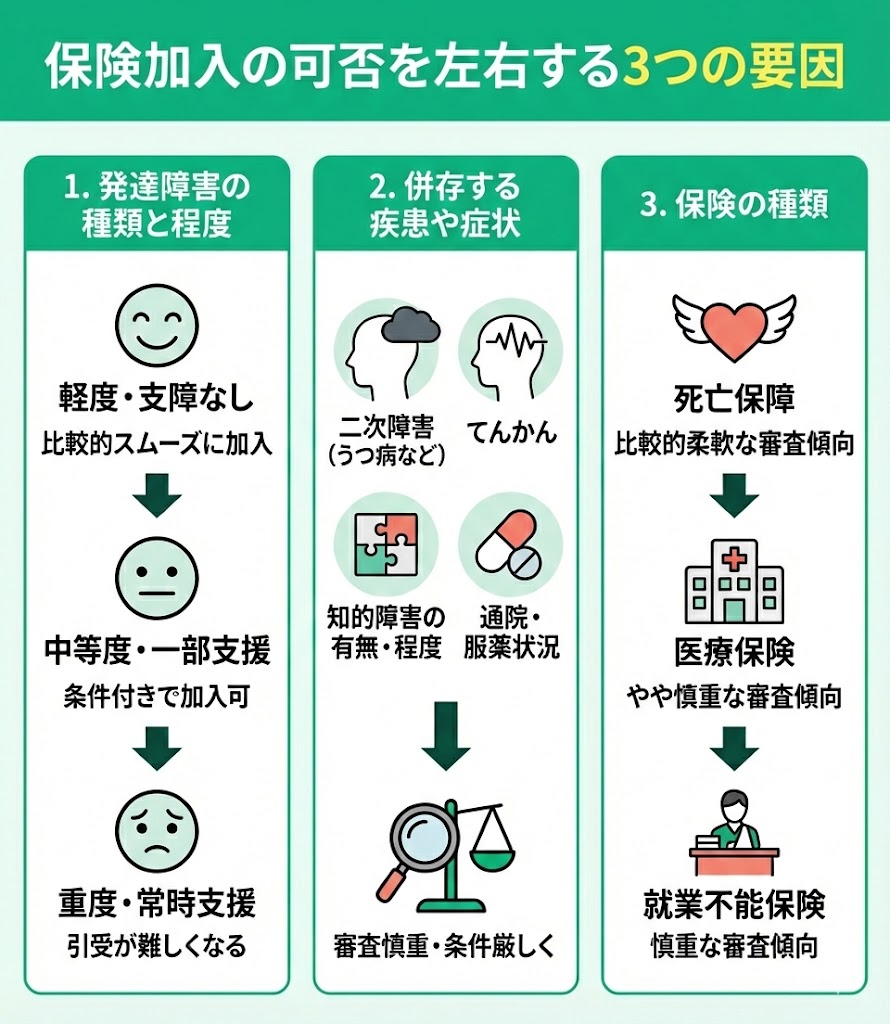 発達障害のある方の保険加入では、主に以下の3つの要素によって、加入のしやすさが変わることがあります。