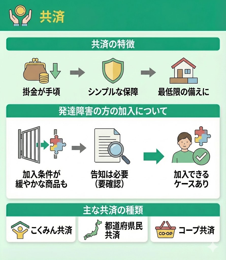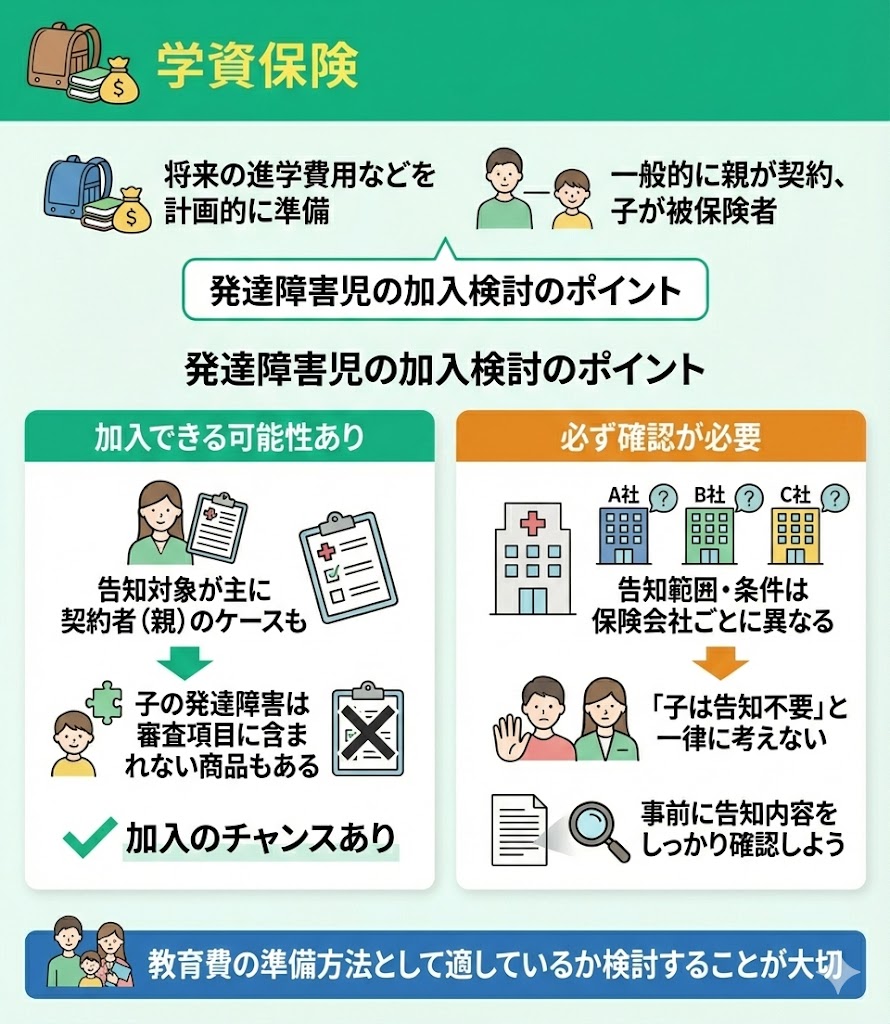 民間の保険に比べて、加入条件が緩やかな商品があるため、発達障害のあるお子さまでも加入できるケースがあります。ただし、共済でも告知は必要で、引受条件は商品ごとに異なるため、申込前に確認しておくことが大切です。