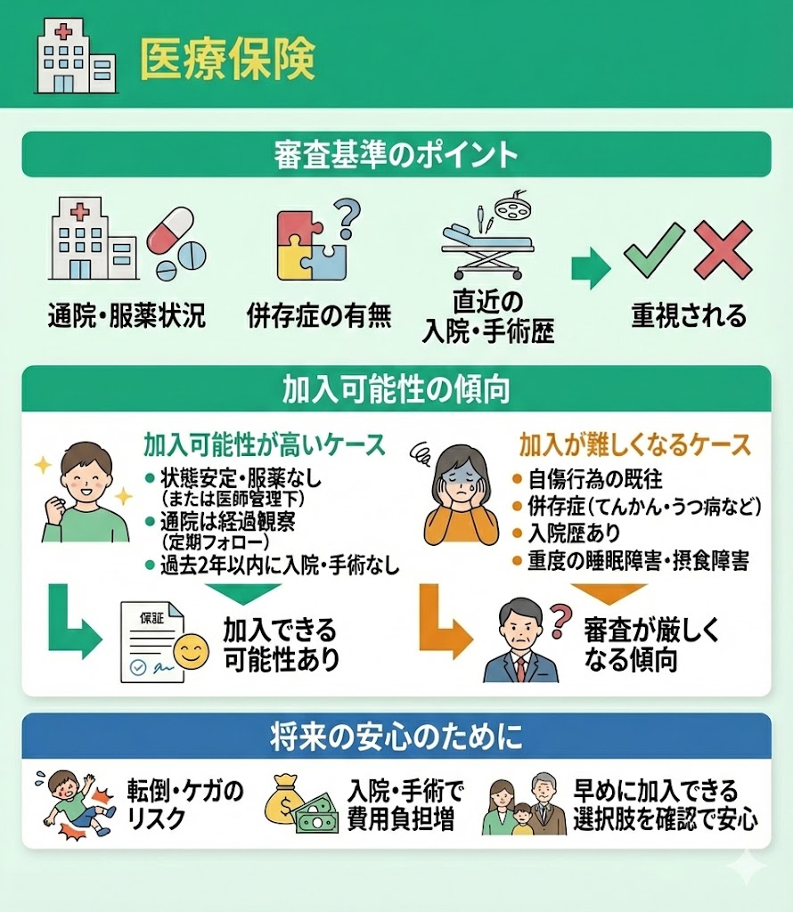 医療保険は、発達障害がある場合に検討できる保険の中でも、審査がやや慎重になりやすい分野です。診断名そのものよりも、通院・服薬の状況や併存症の有無、直近の入院・手術歴などが重視されます。