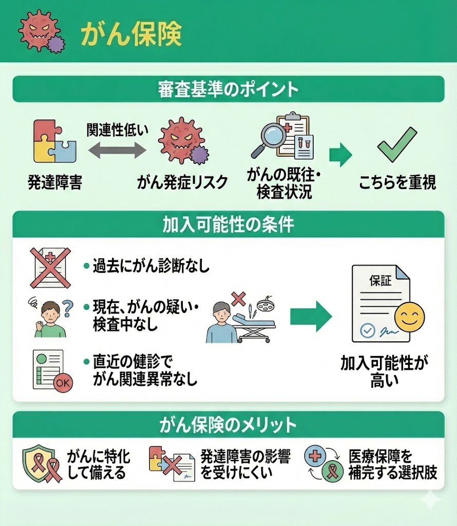発達障害そのものと、がんの発症リスクに直接的な関連があるとは一般に考えにくいため、がん保険は比較的検討しやすい選択肢です。審査でも、発達障害という診断名より「がんに関する既往や検査状況」が主に確認されます。