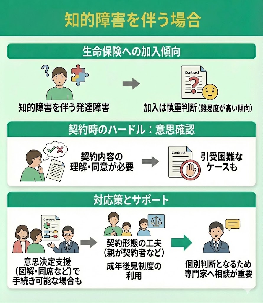 知的障害を伴う発達障害の場合、生命保険への加入は慎重に判断されることが多く、難易度が高くなる傾向があります。