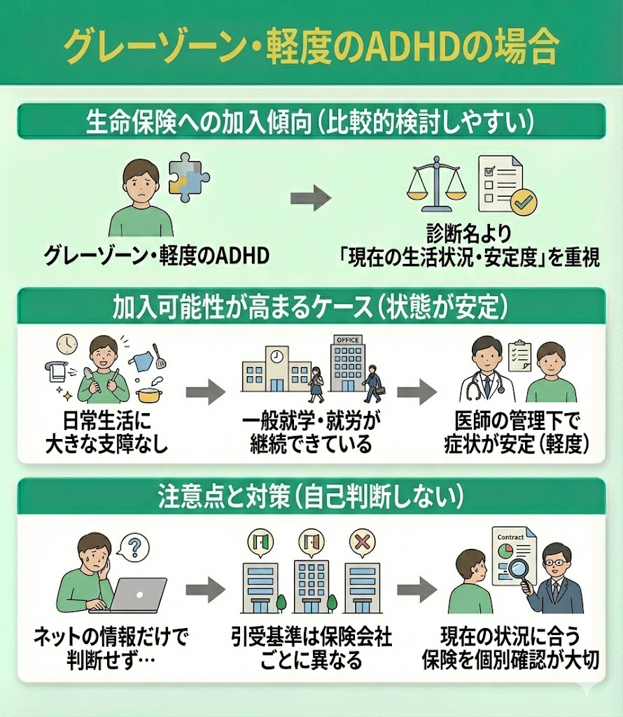 グレーゾーンや軽度のADHDに該当する場合、生命保険は比較的検討しやすいケースが多いです。診断名そのものよりも、現在の生活状況や症状の安定度が重視されます。