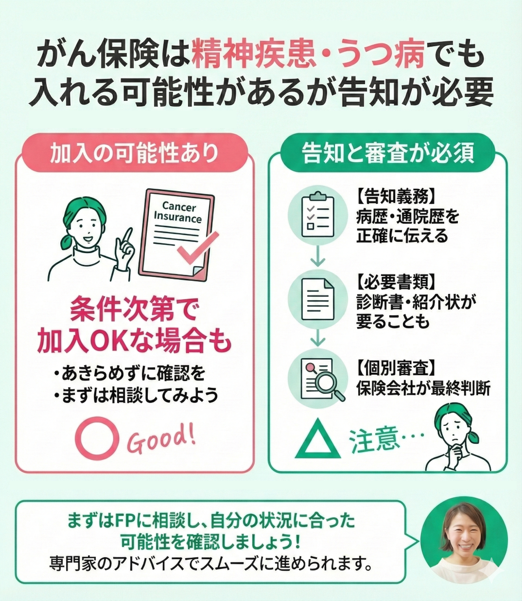 精神疾患やうつ病を持っている方でもがん保険に入ることは可能であり、大切なのは正しく告知することです。