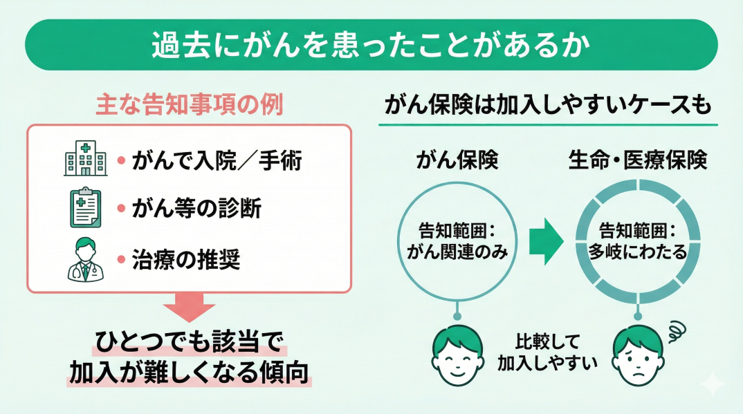 告知事項は保険会社によって異なりますが、必要となる告知内容の1つ目は、過去にがんを患ったことがあるかどうかです。