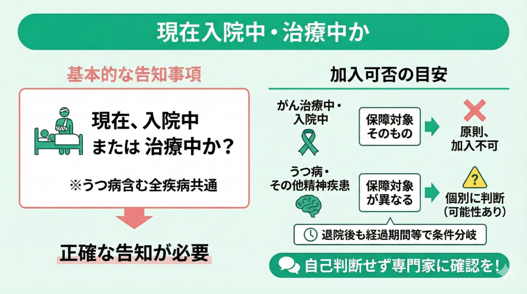 がん保険の告知では、現在入院しているかまたは病気やケガで治療を受けているかが確認されます。この点は、うつ病を含むすべての疾病に共通する基本的な告知項目です。