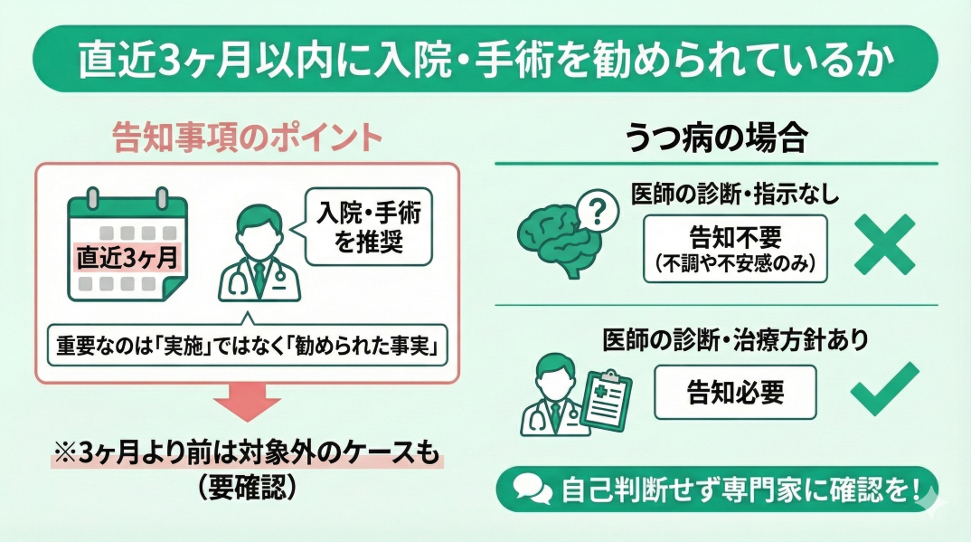 ここで重要なのは、「実際に入院・手術をしたか」ではなく、医師から勧められている事実があるかどうかが問われている点です。直近3か月以内にそのような事実があれば、告知が必要となる可能性があります。